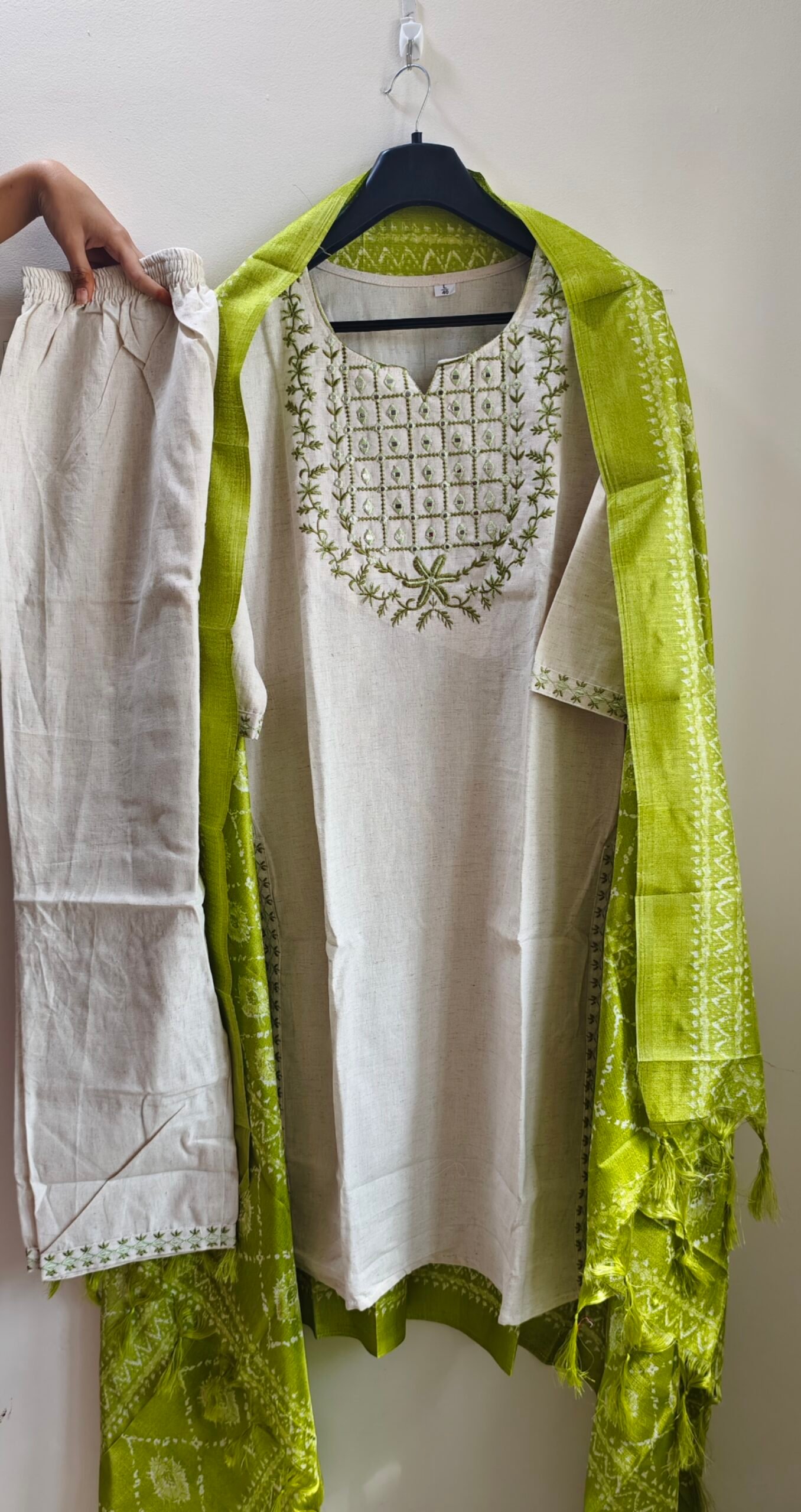 Elegant cream cotton kurta set with fine green embroidery, paired with matching pants and a printed green dupatta. Perfect for daily wear, office, and festive casual occasions.