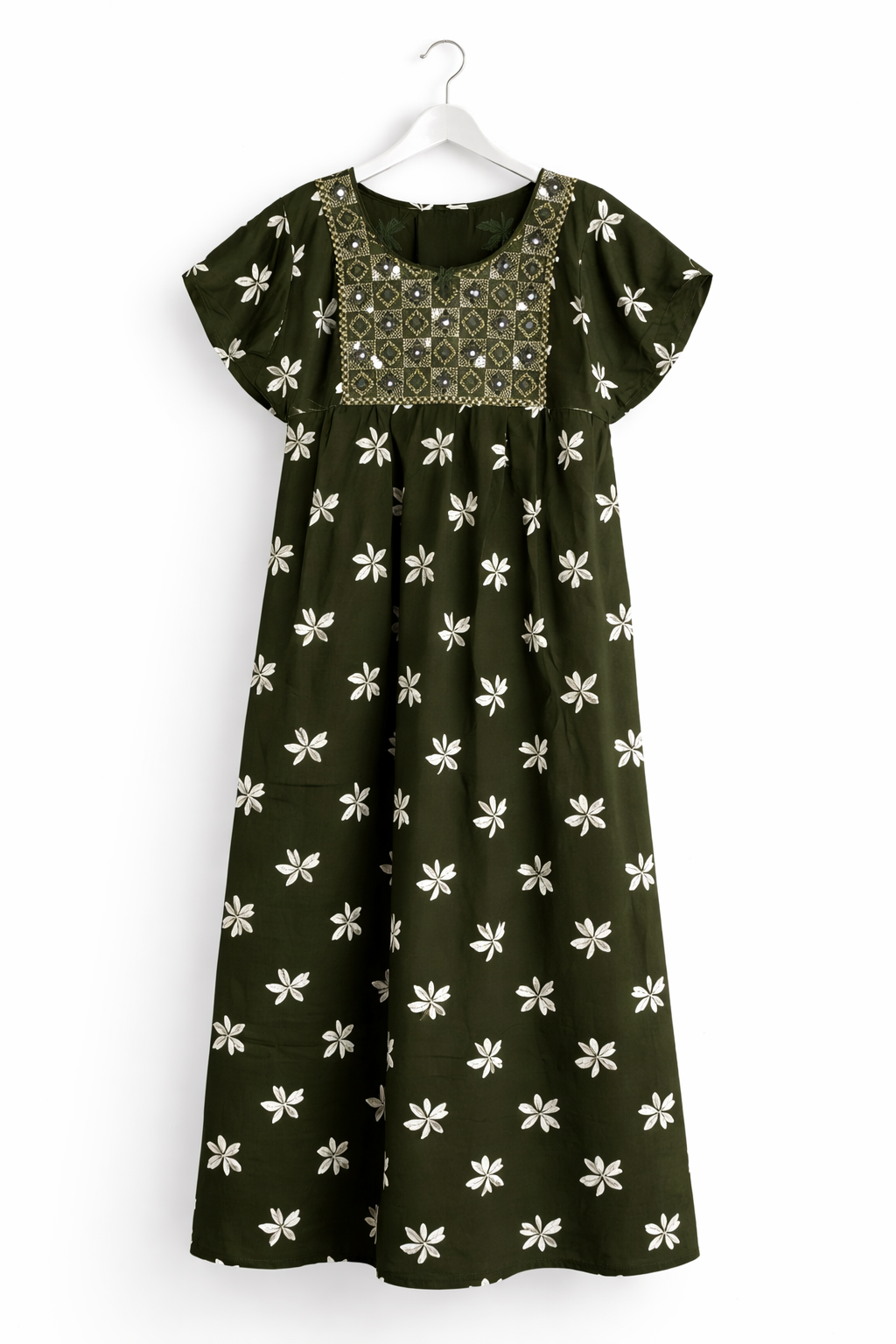 Comfortable dark green floral printed cotton nighty with embroidered yoke and relaxed fit. Soft, breathable, and perfect for daily nightwear and home wear.