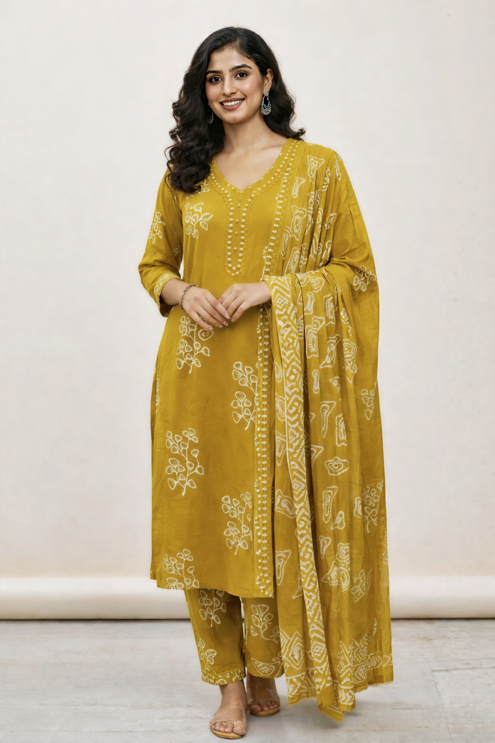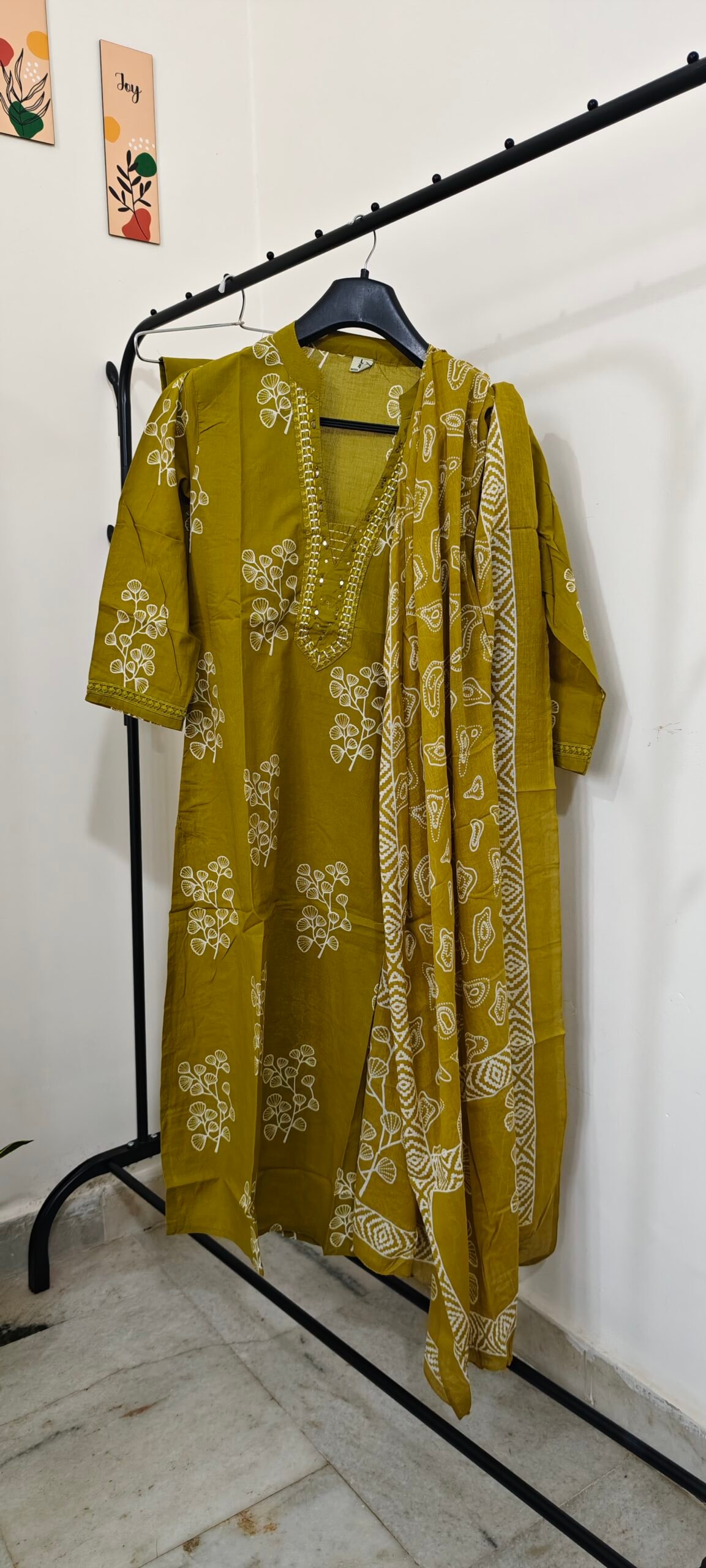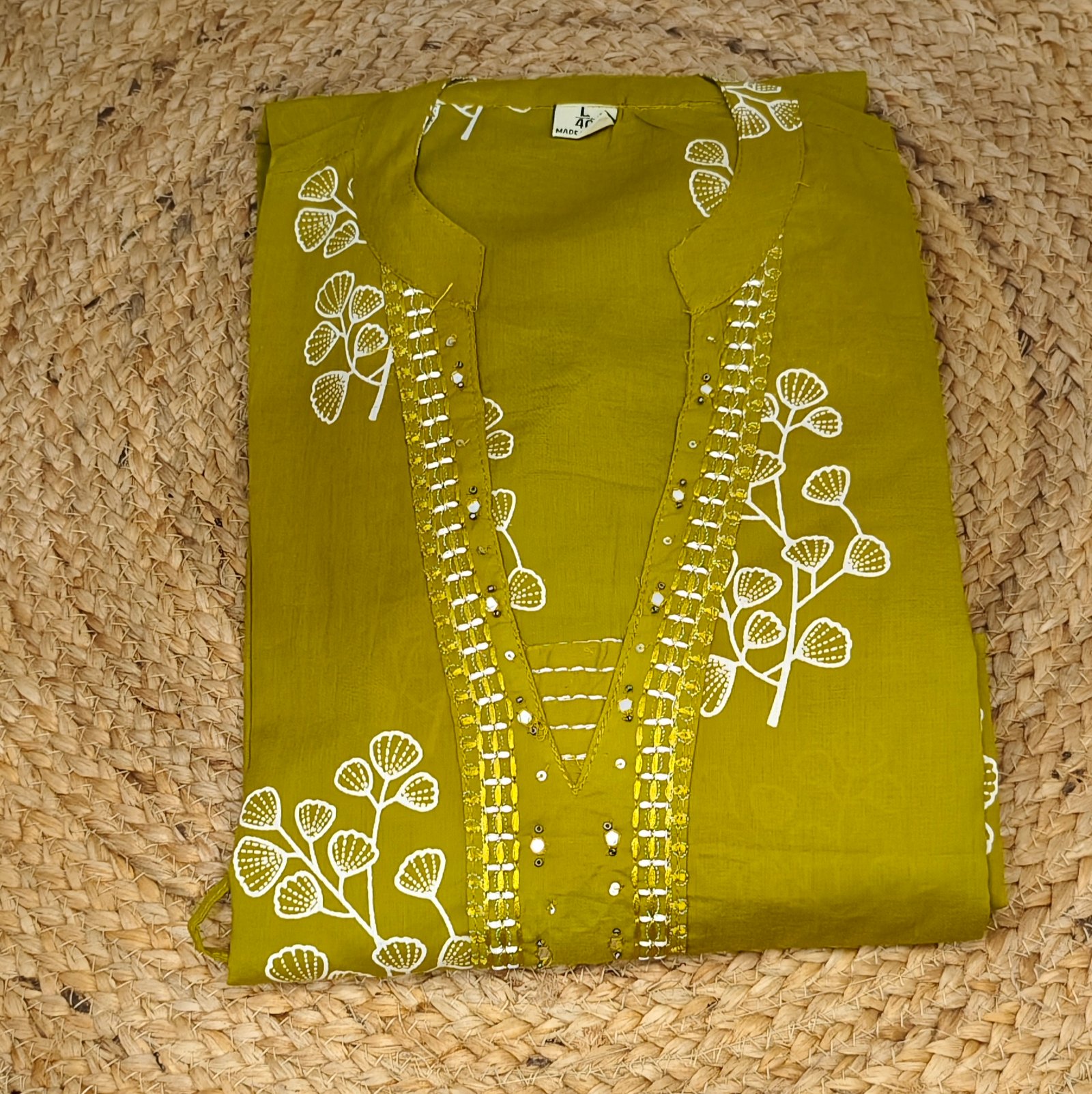 Add timeless elegance to your wardrobe with this beautiful mustard yellow cotton kurti set. Designed with subtle hand-printed floral motifs, this outfit blends traditional charm with modern comfort. The breathable cotton fabric keeps you comfortable all day, while the matching printed dupatta completes the ethnic look effortlessly Soft & breathable pure cotton.