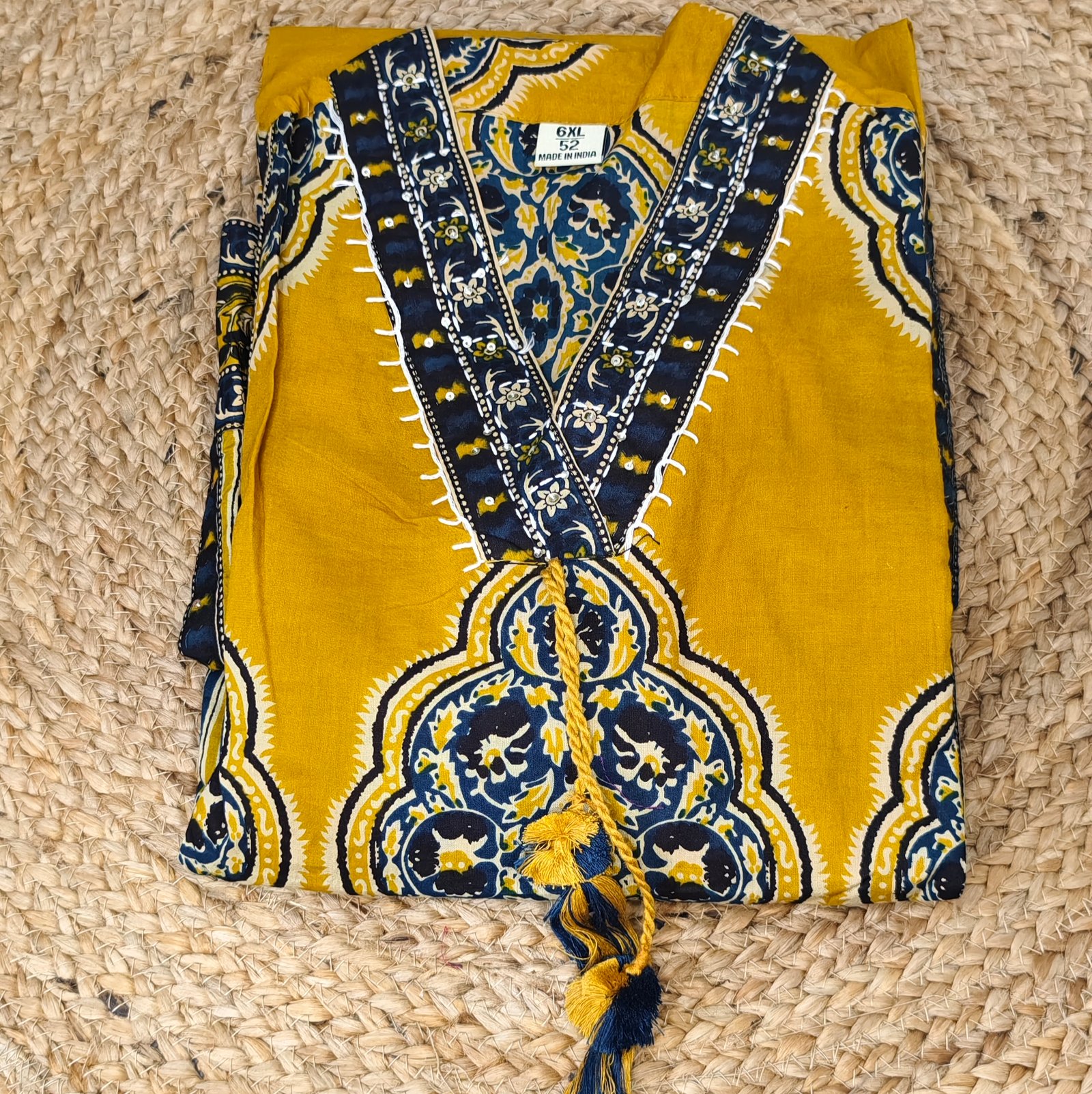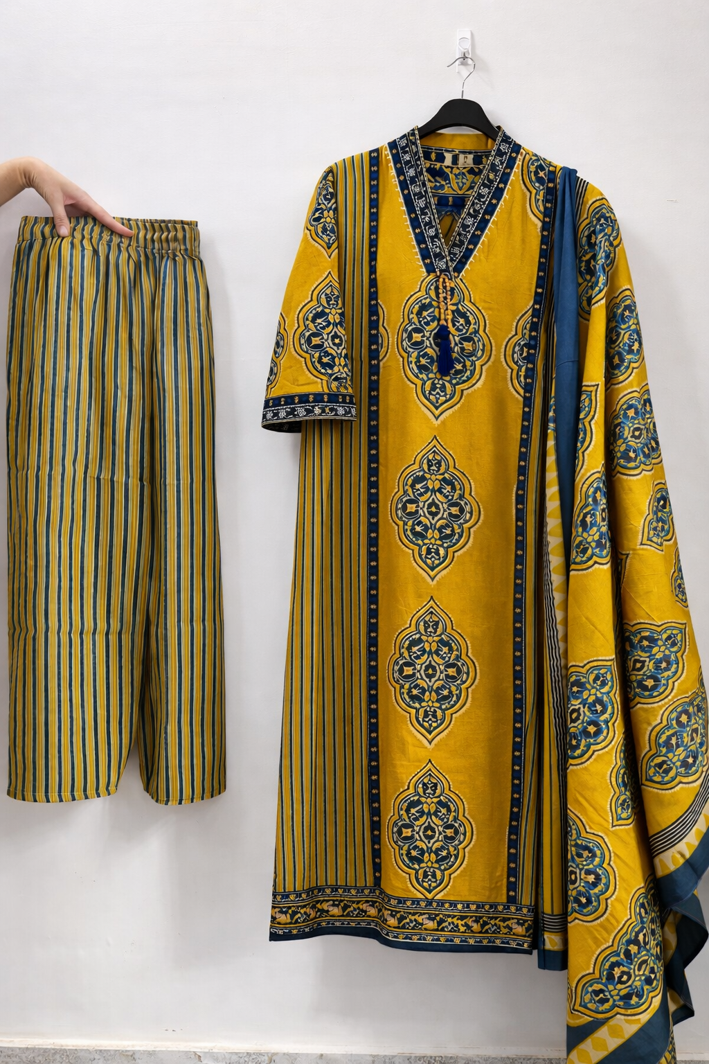 Make a bold yet elegant statement with this mustard yellow and navy printed cotton kurta set, designed for everyday comfort and timeless ethnic style. Crafted from soft, breathable cotton fabric, this 3-piece set ensures ease of movement while keeping you effortlessly stylish.