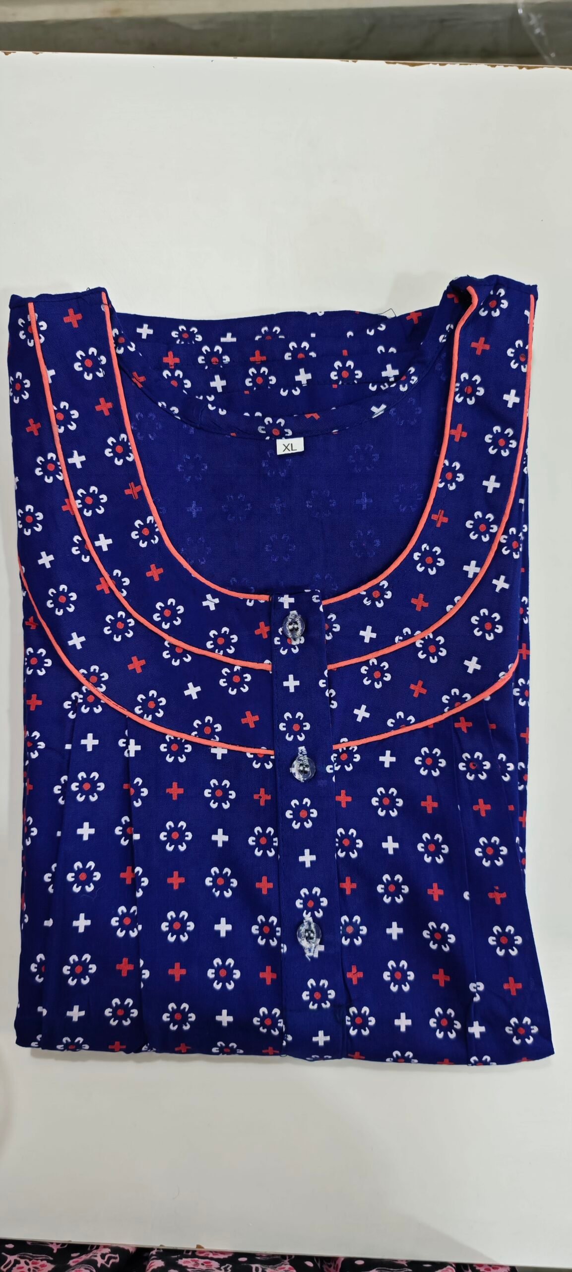 Soft navy blue floral printed cotton nighty with contrast piping and relaxed fit. Breathable, lightweight, and perfect for nightwear and daily home wear.