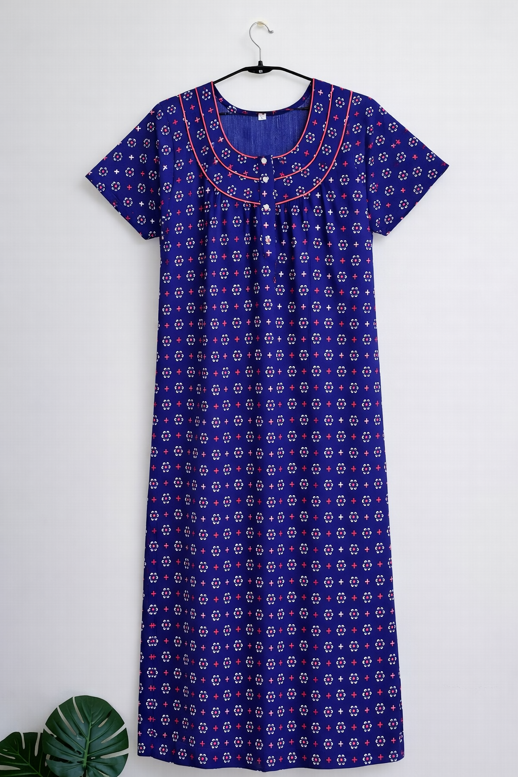 Feature Details Product Type Nighty / Night Dress Length Maxi Length Fabric Pure Cotton Color Navy Blue Print Floral Print Neck Type Round Neck with Button Placket Sleeve Type Short Sleeves Fit Relaxed / Comfort Fit Occasion Night Wear, Home Wear, Lounge Wear Pattern All-Over Floral Print Wash Care Gentle Machine Wash / Hand Wash Country of Origin India