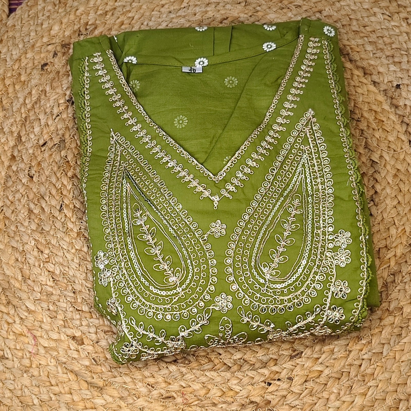 Step into graceful elegance with this olive green embroidered cotton Anarkali kurta set, designed to offer comfort with a festive charm. Crafted from soft, breathable cotton, this 3-piece ensemble features a beautifully flared Anarkali silhouette that adds effortless movement and sophistication