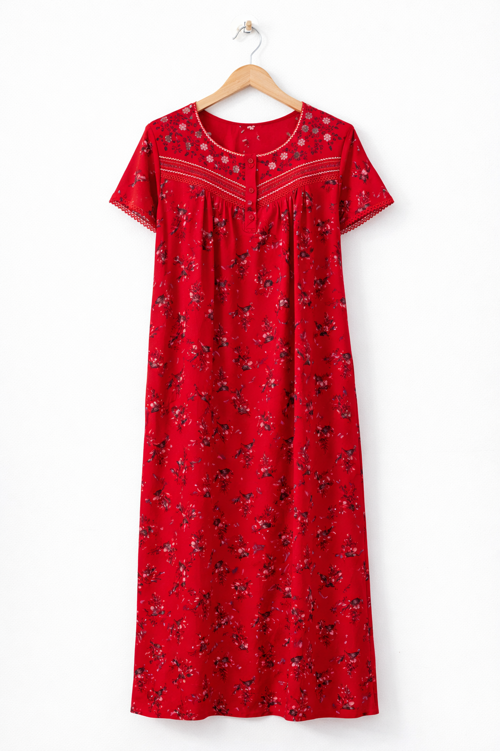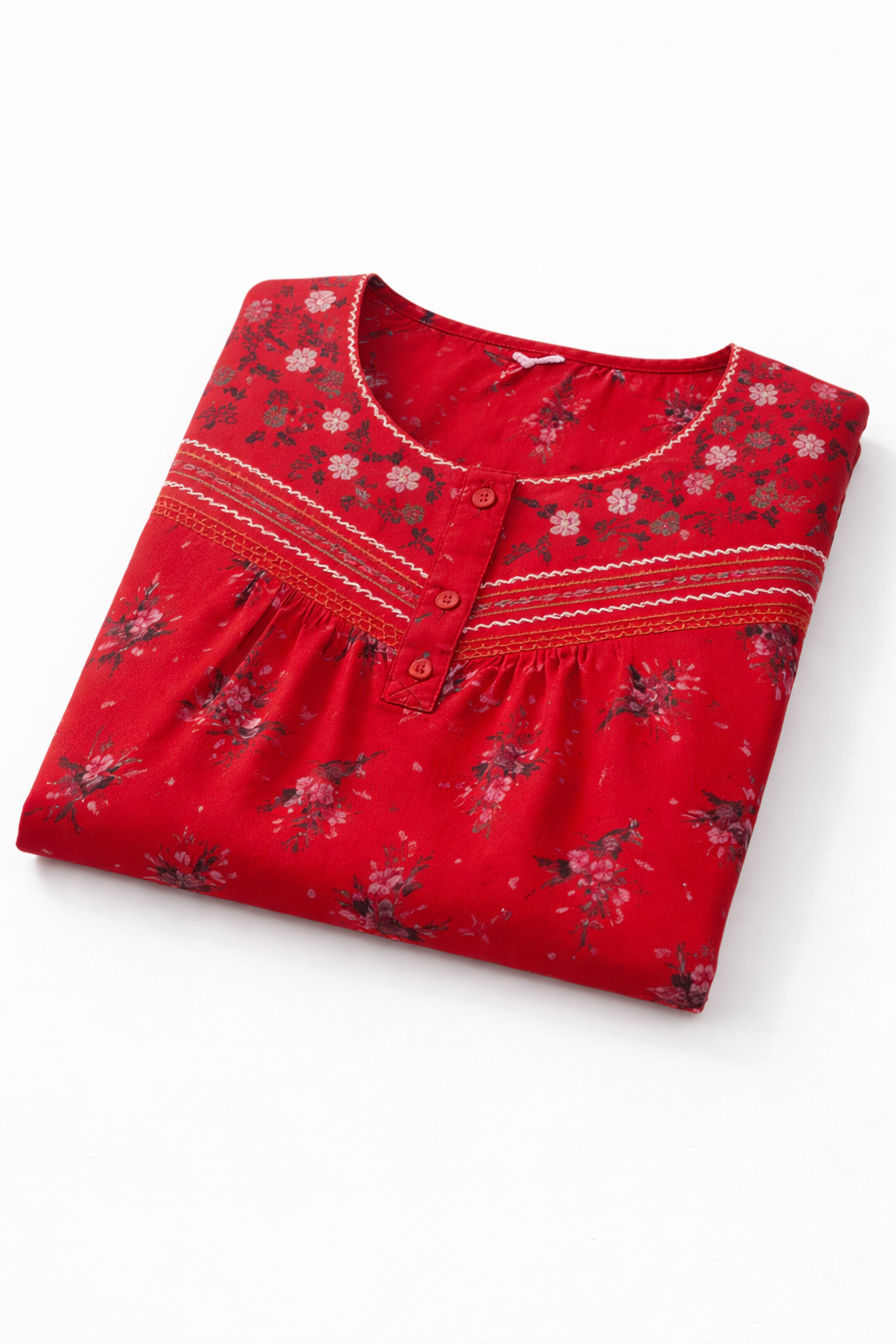 Experience comfort and elegance with this beautifully designed red floral cotton nighty, perfect for daily wear and relaxing evenings. Made with soft and breathable fabric, this nighty ensures all-day comfort while maintaining a stylish look. The floral print adds a feminine charm, while the relaxed fit allows easy movement and maximum comfort. Soft & breathable cotton fabric for all-night comfort