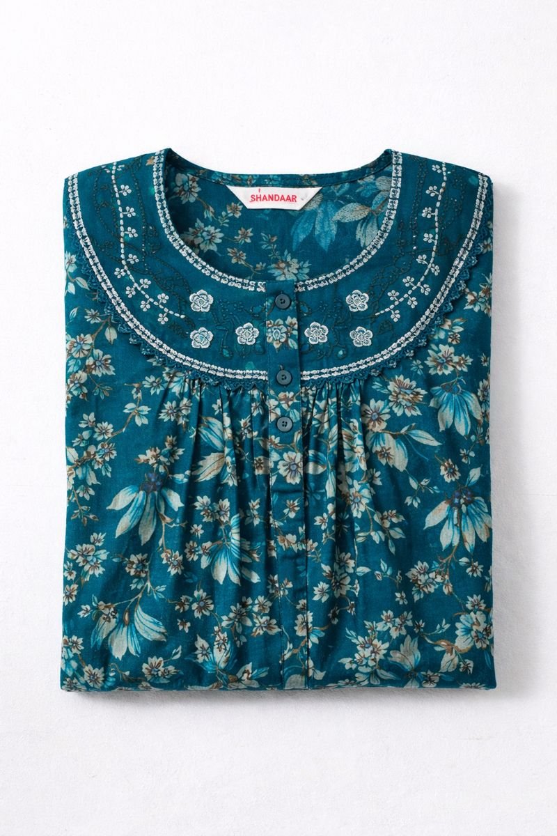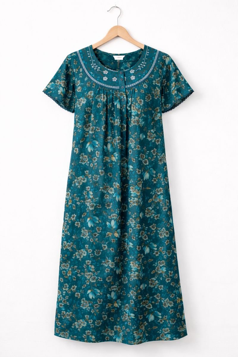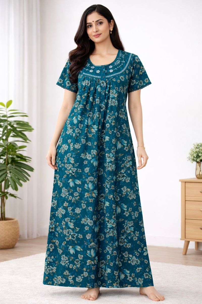 Upgrade your daily comfort wear with this Sea Green Floral Cotton Nighty, designed for relaxed home use and peaceful sleep. Crafted from breathable cotton fabric, this nighty feels soft on the skin and keeps you comfortable throughout the day and night
