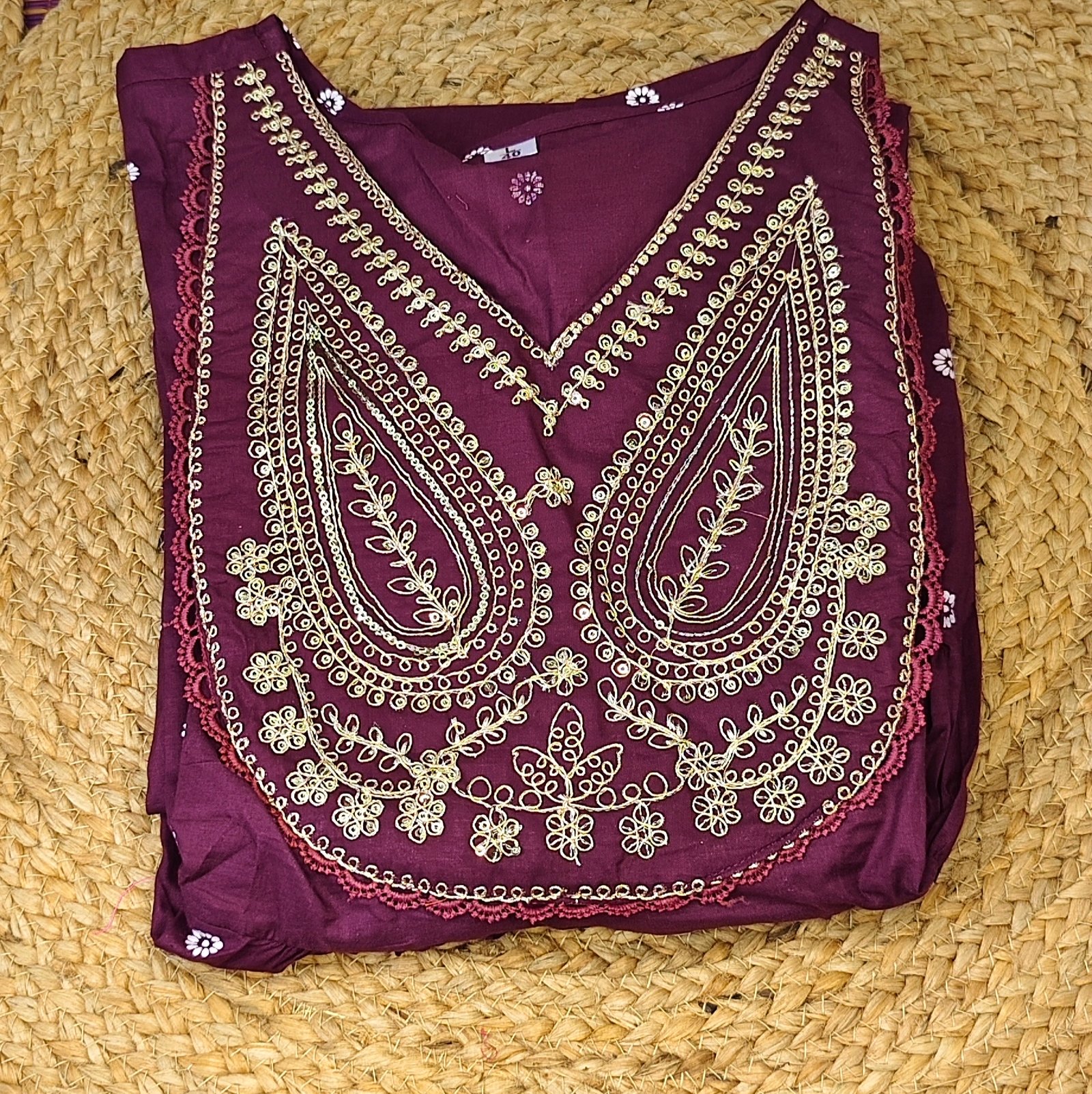 Feature Details Product Type Anarkali Kurta Set Set Includes Kurta, Pant & Dupatta Fabric Pure Cotton Color Wine Purple Work Embroidery Neck Type V Neck Sleeve Type 3/4th Sleeves Kurta Style Anarkali / Flared Pant Style Straight Fit, Elastic Waist Dupatta Embroidered, Lightweight Occasion Festive Wear, Wedding Functions, Traditional Events Fit Regular Fit Wash Care Gentle Machine Wash / Hand Wash Country of Origin India