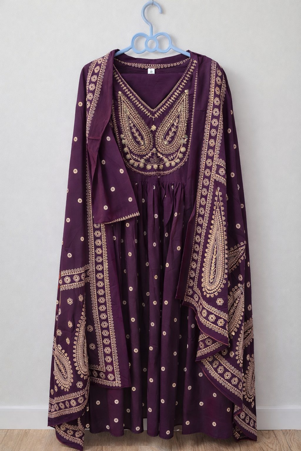 Graceful wine purple embroidered cotton Anarkali kurta set with matching pants and dupatta. Rich color, elegant embroidery, and perfect for festive and special occasions