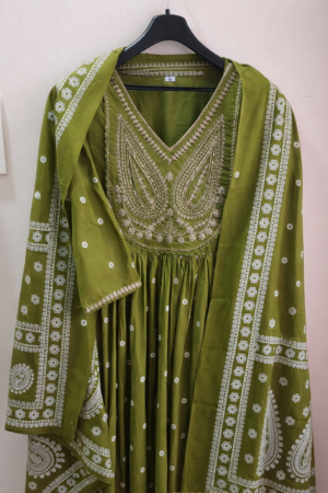Olive Green Embroidered Cotton Anarkali Kurta Set