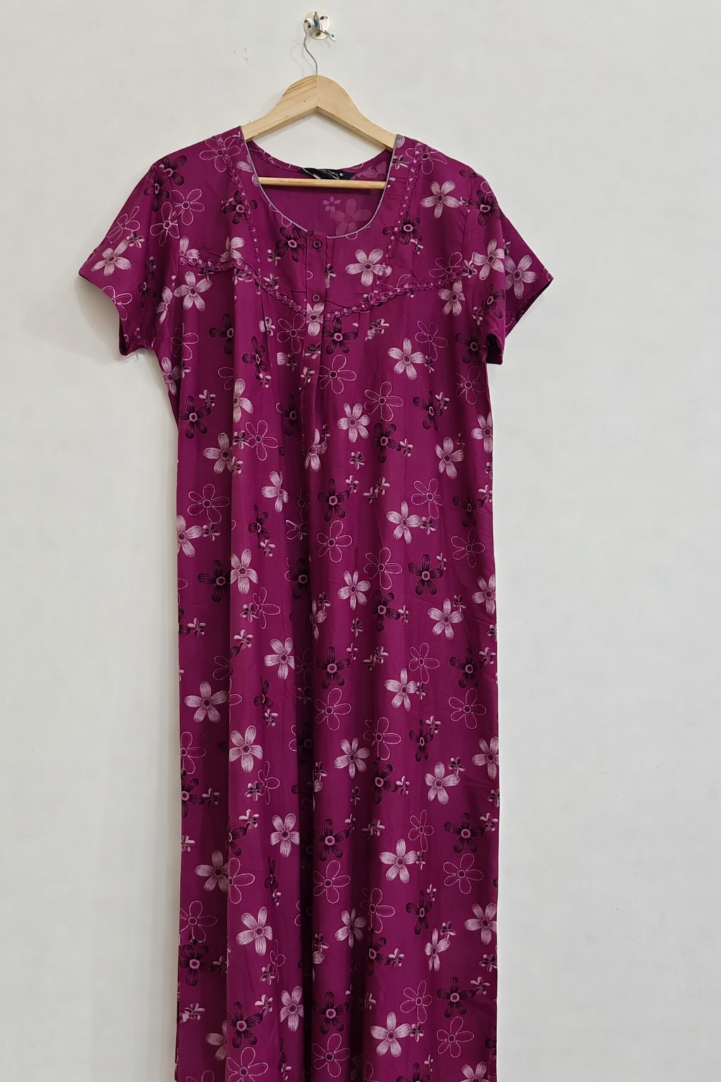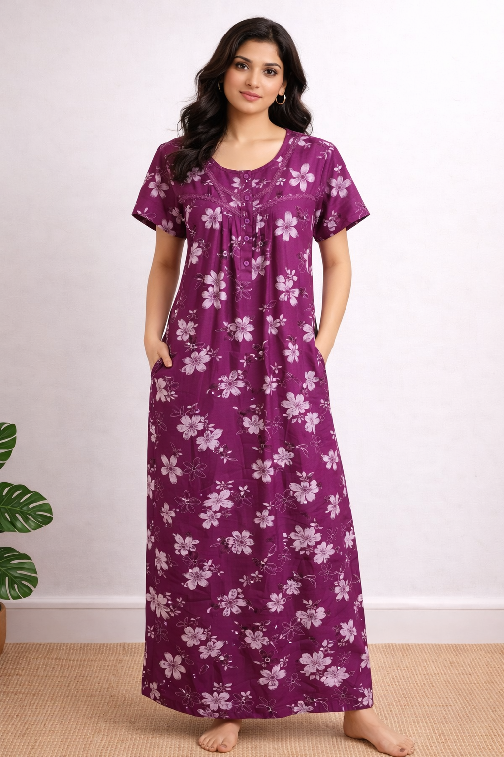 Feature Details Product Type Women Maxi Nighty Fabric Soft Cotton Pattern Floral Print Color Magenta Neck Type Round Neck with Button Placket Sleeve Type Short Sleeves Length Full Length / Maxi Fit Relaxed Comfortable Fit Pocket Yes, Side Pockets Suitable For Night Wear & Home Wear Wash Care Machine & Hand Wash Season Suitable for All Seasons