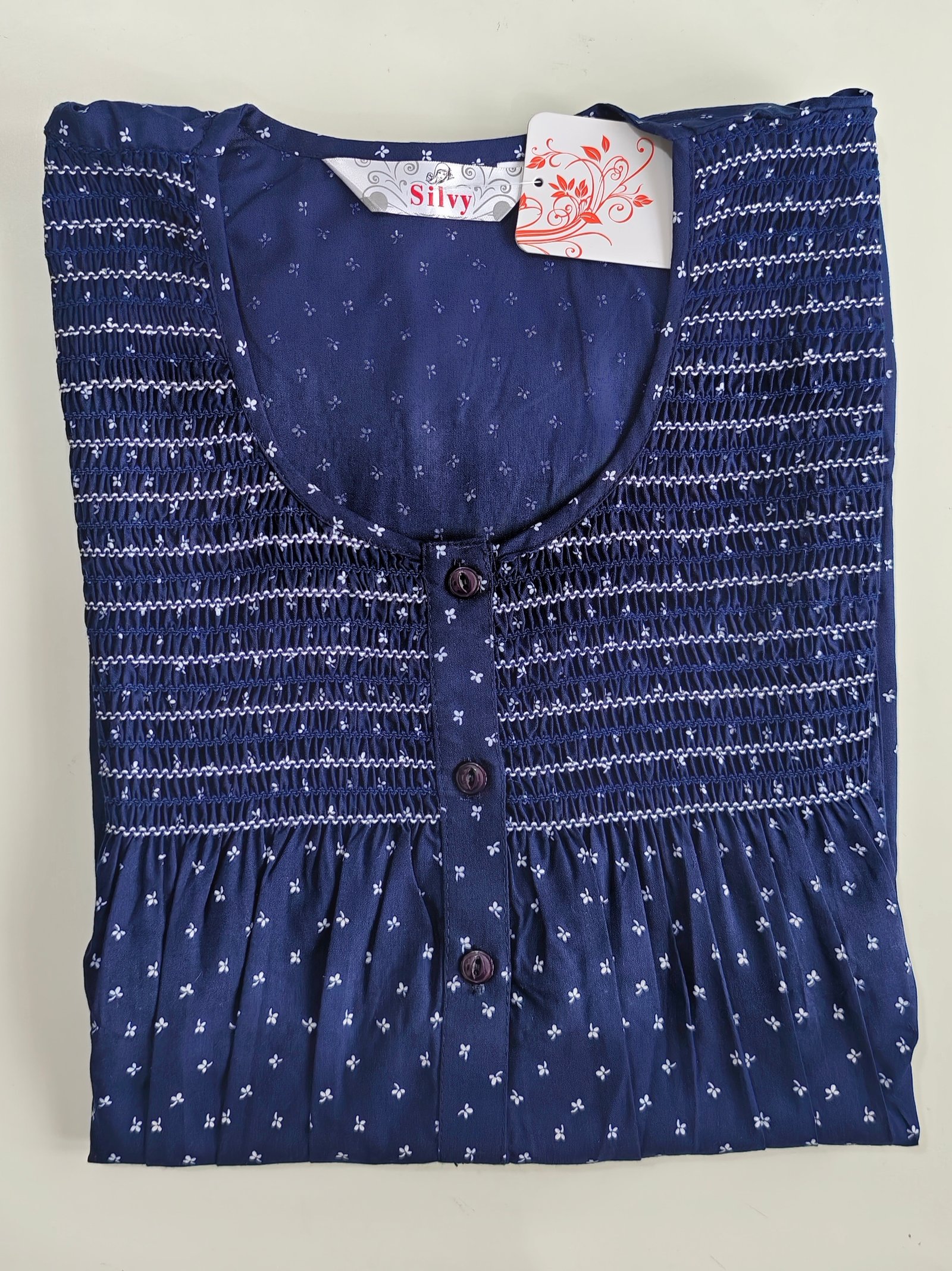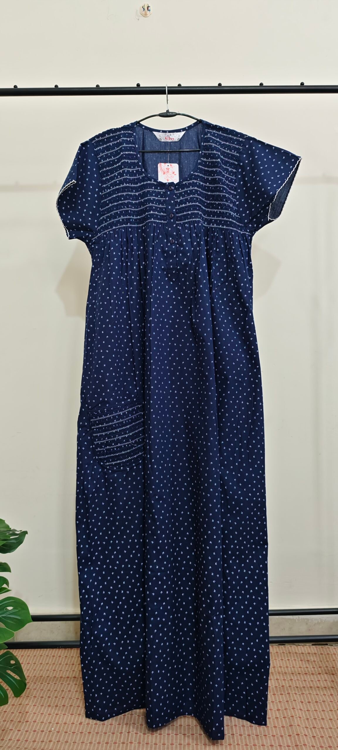 Feature Details Product Type Women Maxi Nighty Fabric Soft Cotton Pattern Printed Color Navy Blue Neck Type Round Neck with Button Detail Sleeve Type Short Sleeves Length Full Length / Maxi Fit Relaxed Comfortable Fit Pocket Yes, Side Pocket Suitable For Night Wear & Home Wear Wash Care Machine & Hand Wash Season Suitable for All Seasons